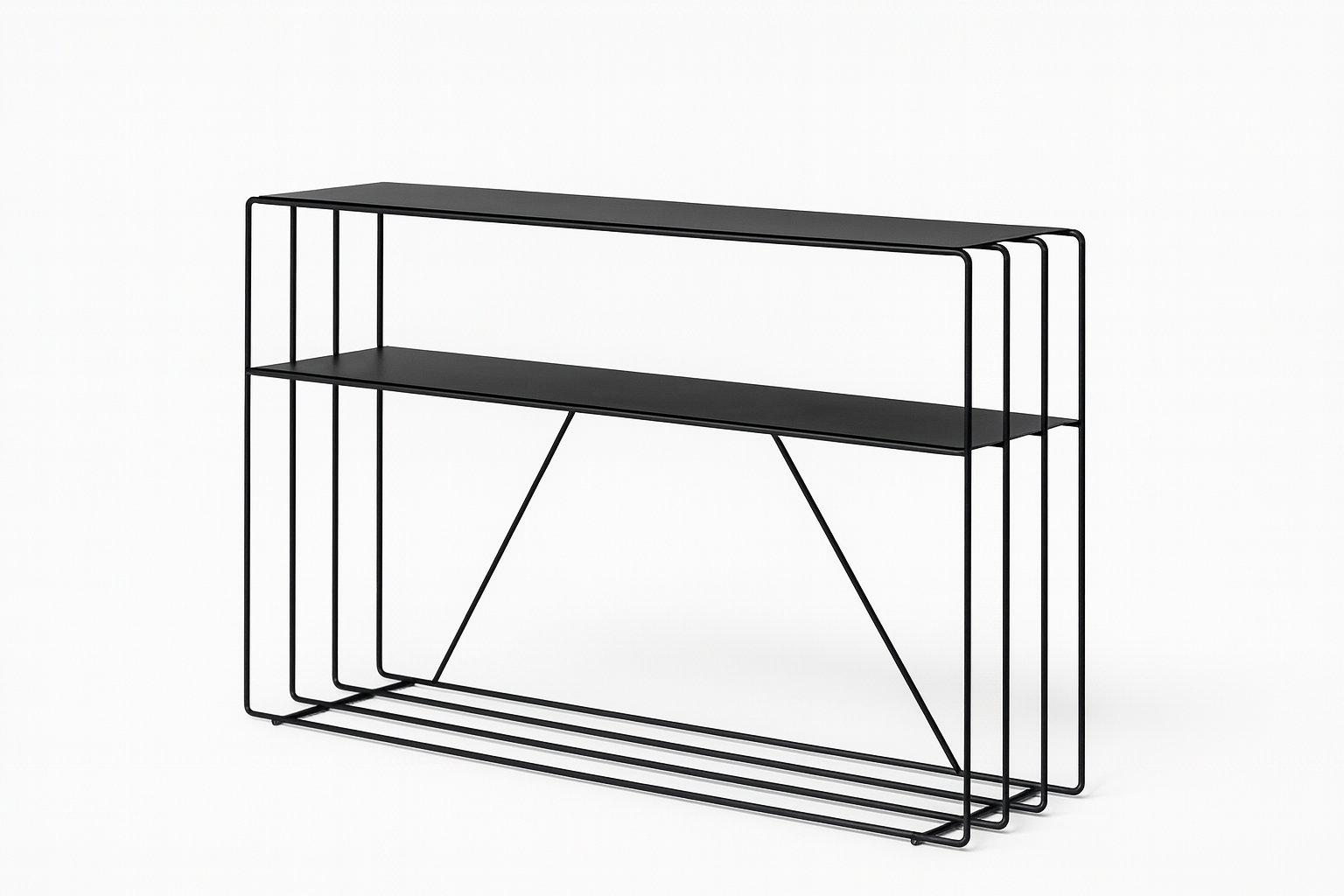 A light yet bold metal console defined by continuous linear frames and open negative space.